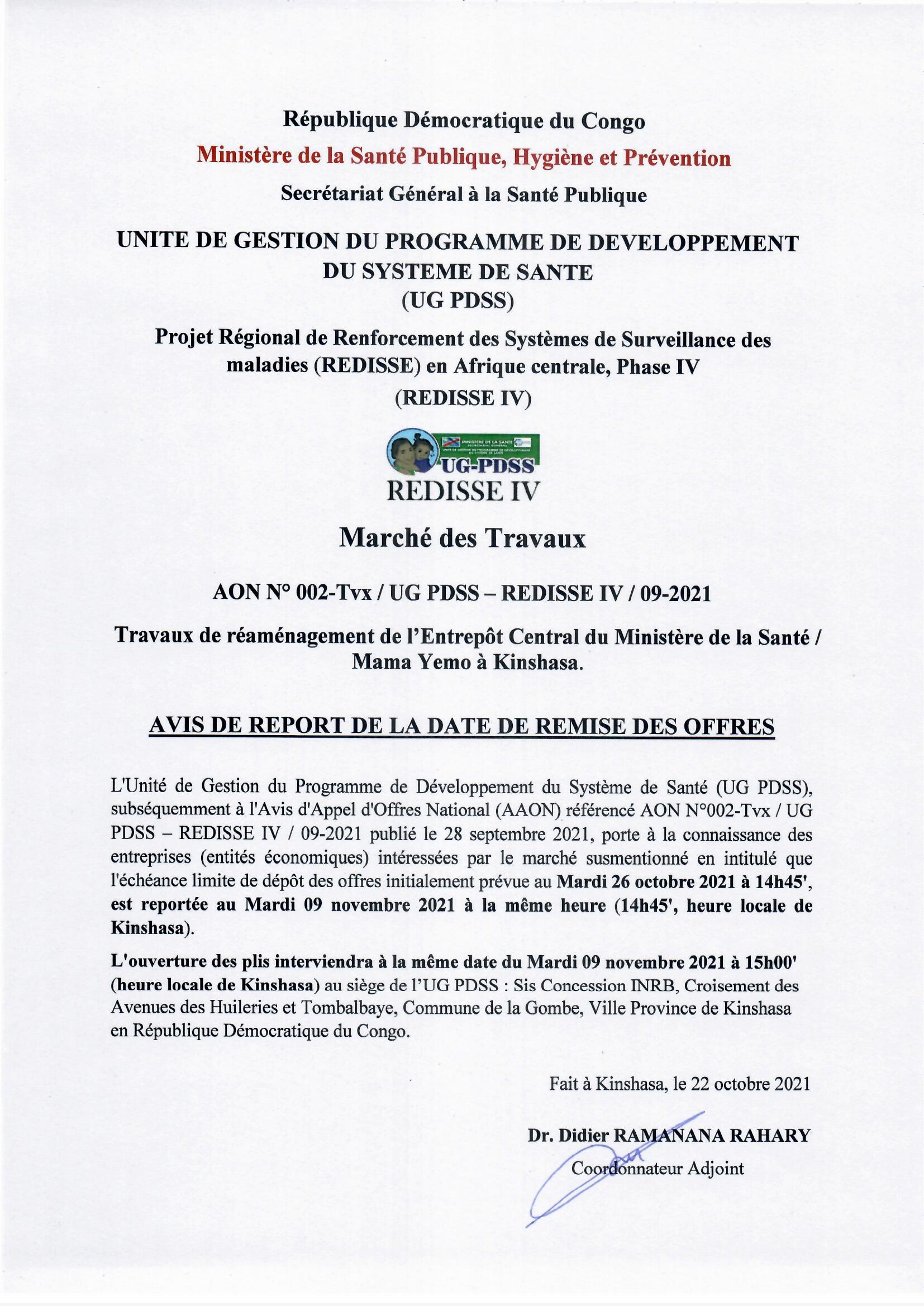 By Guylain Mafuta Avis de report de la date de remise des offres : Travaux de réaménagement de l’Entrepôt Central du Ministère de la Santé / Mama Yemo à Kinshasa RDC Publié il y a 4 ans Les candidatures sont actuellement fermées. Site ugpdss.cd UG-PDSS - REDISSE IV No Comments 23 octobre 2021