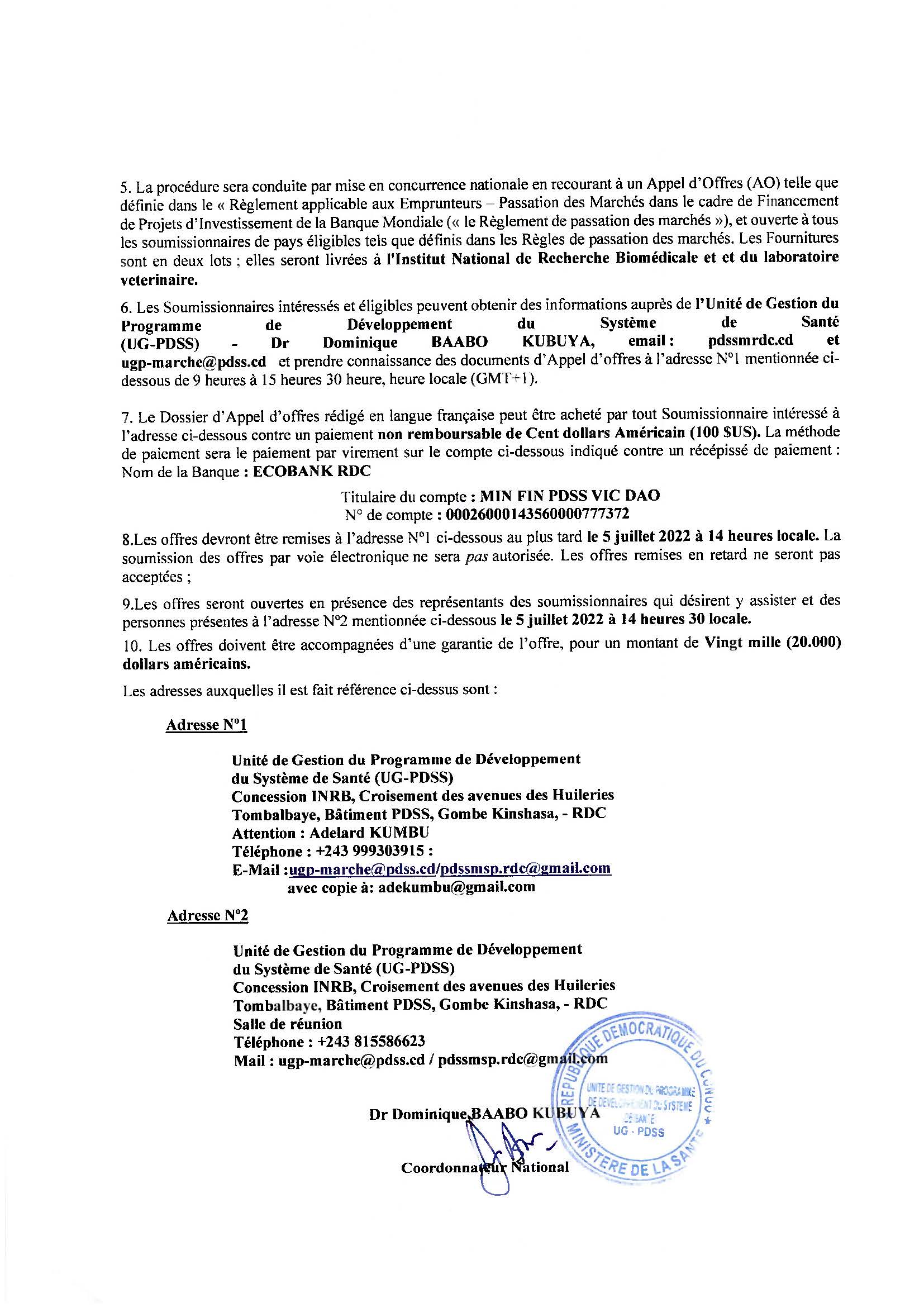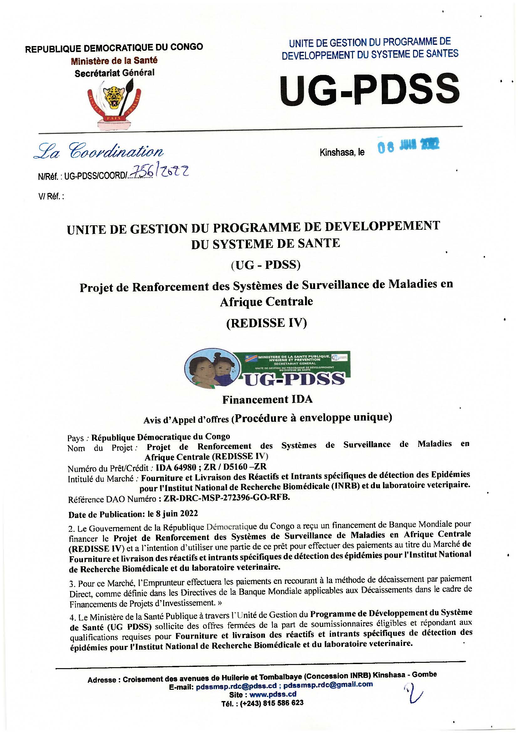 By Guylain Mafuta Fourniture et livraison des Réactifs et Intrants spécifiques de détection des Epidémies pour l’INRB et du Laboratoire vétérinaire UG-PDSS - REDISSE IV Publié il y a 4 ans Les candidatures sont actuellement fermées. Site ugpdss UG-PDSS - REDISSE IV No Comments 9 juin 2022