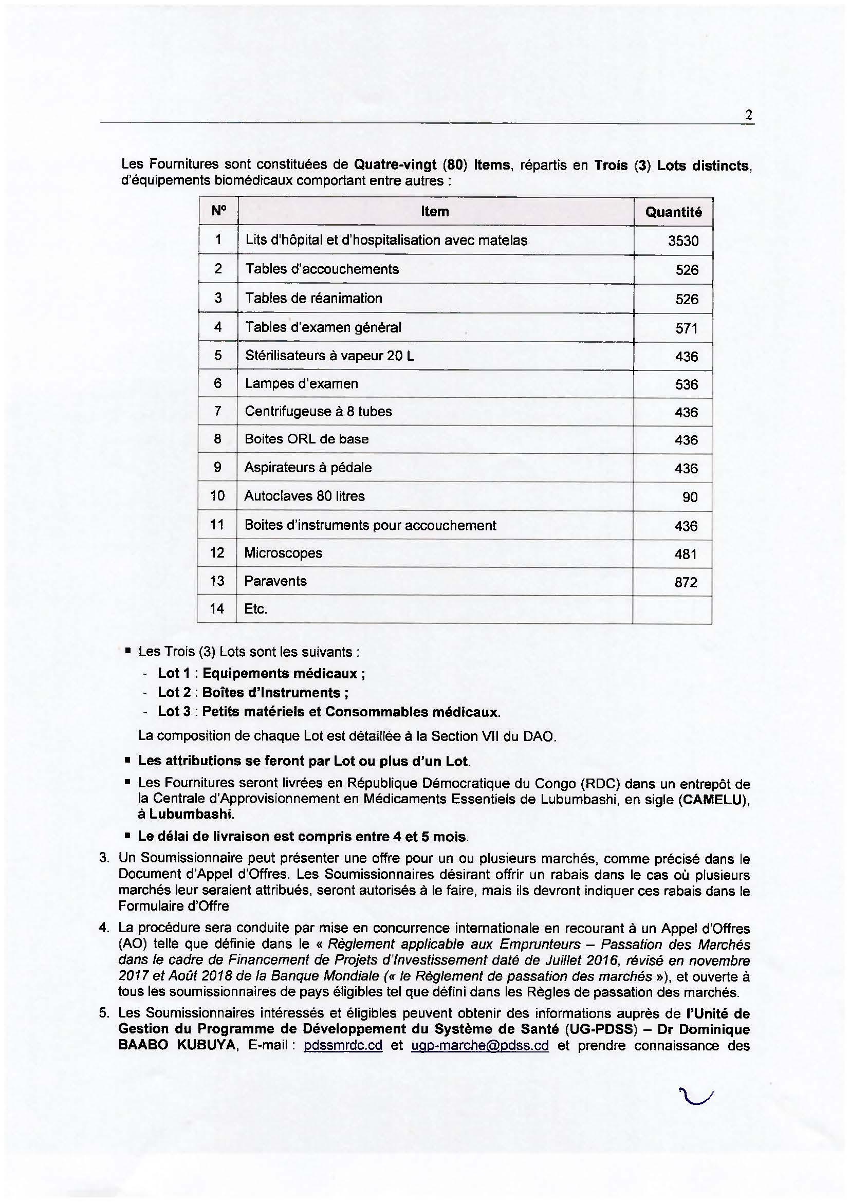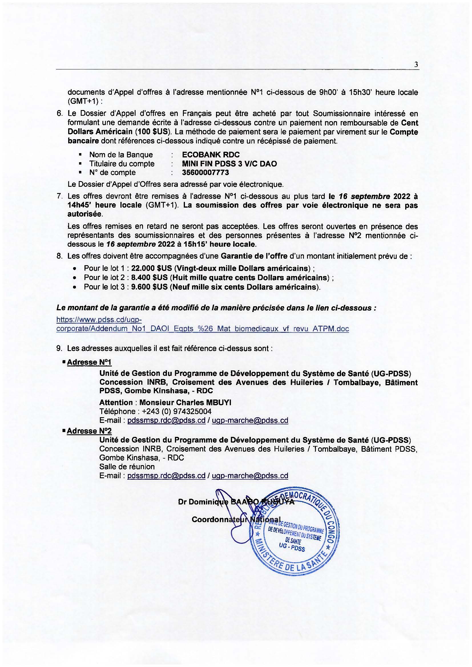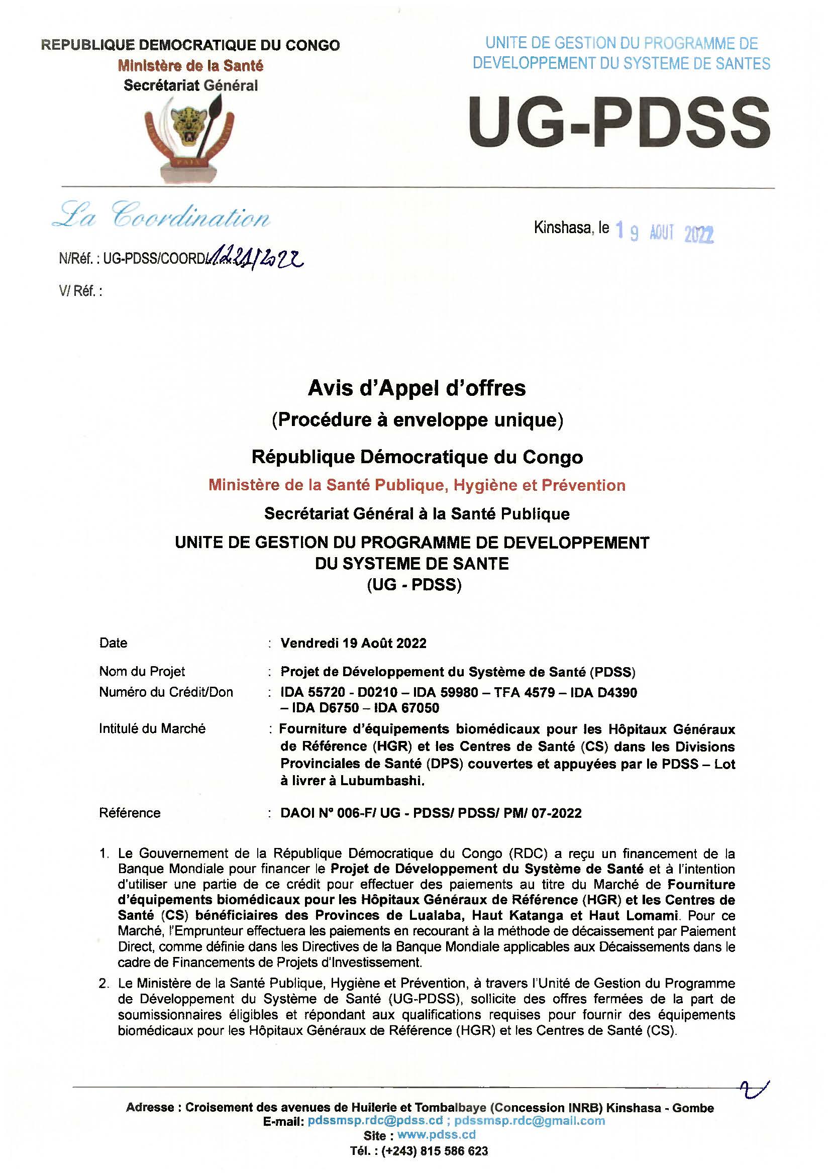ADDENDUM N°1 : DAOI N° 006-F/UG-PDSS/PDSS/PM/07-2022 – Fourniture d’équipements biomédicaux pour les Hôpitaux Généraux de Référence (HGR) et les Centres de Santé (CS) dans les Divisions Provinciales de Santé (DPS) couvertes et appuyées par le PDSS