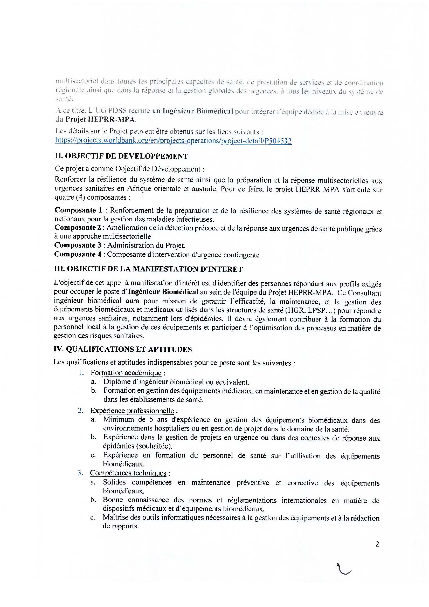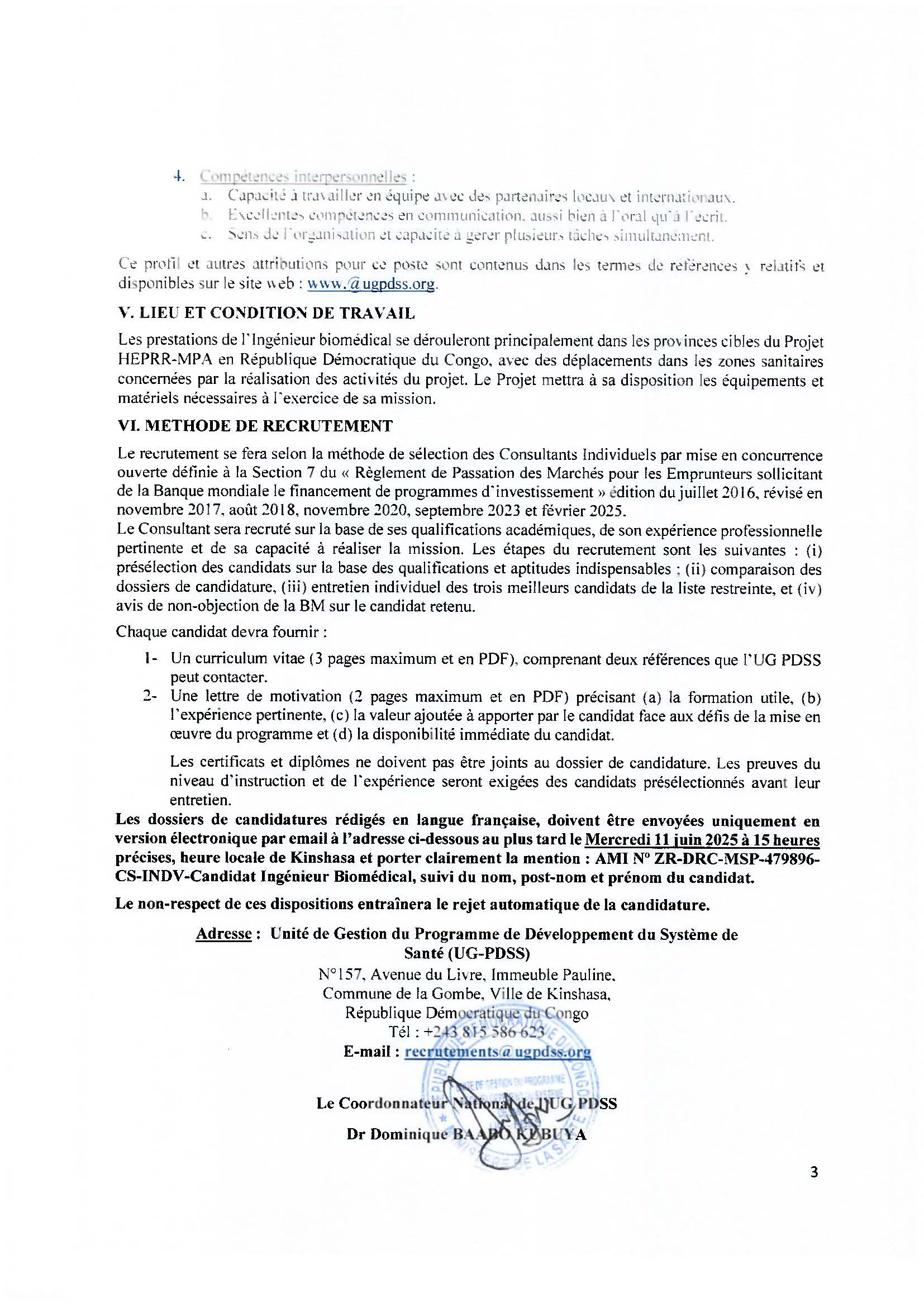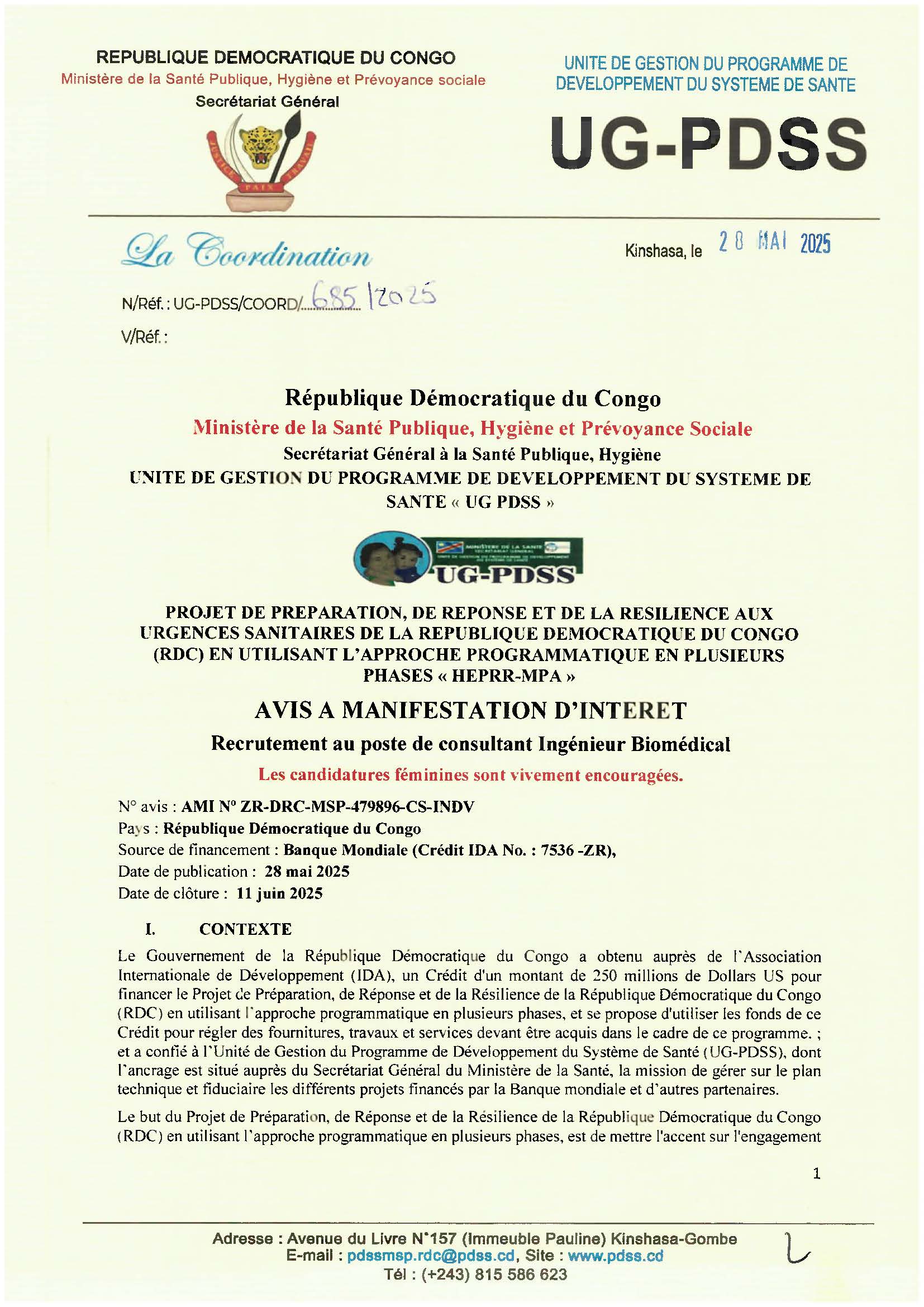 By Guylain Mafuta Avis à Manifestation d’Intérêt N° ZR-DRC-MSP-479896-CS-INDV : Recrutement au poste de consultant Ingénieur Biomédical RDC Publié il y a 11 mois Les candidatures sont actuellement fermées. Site ugpdss UG-PDSS - HEPRR-MPA No Comments 28 mai 2025