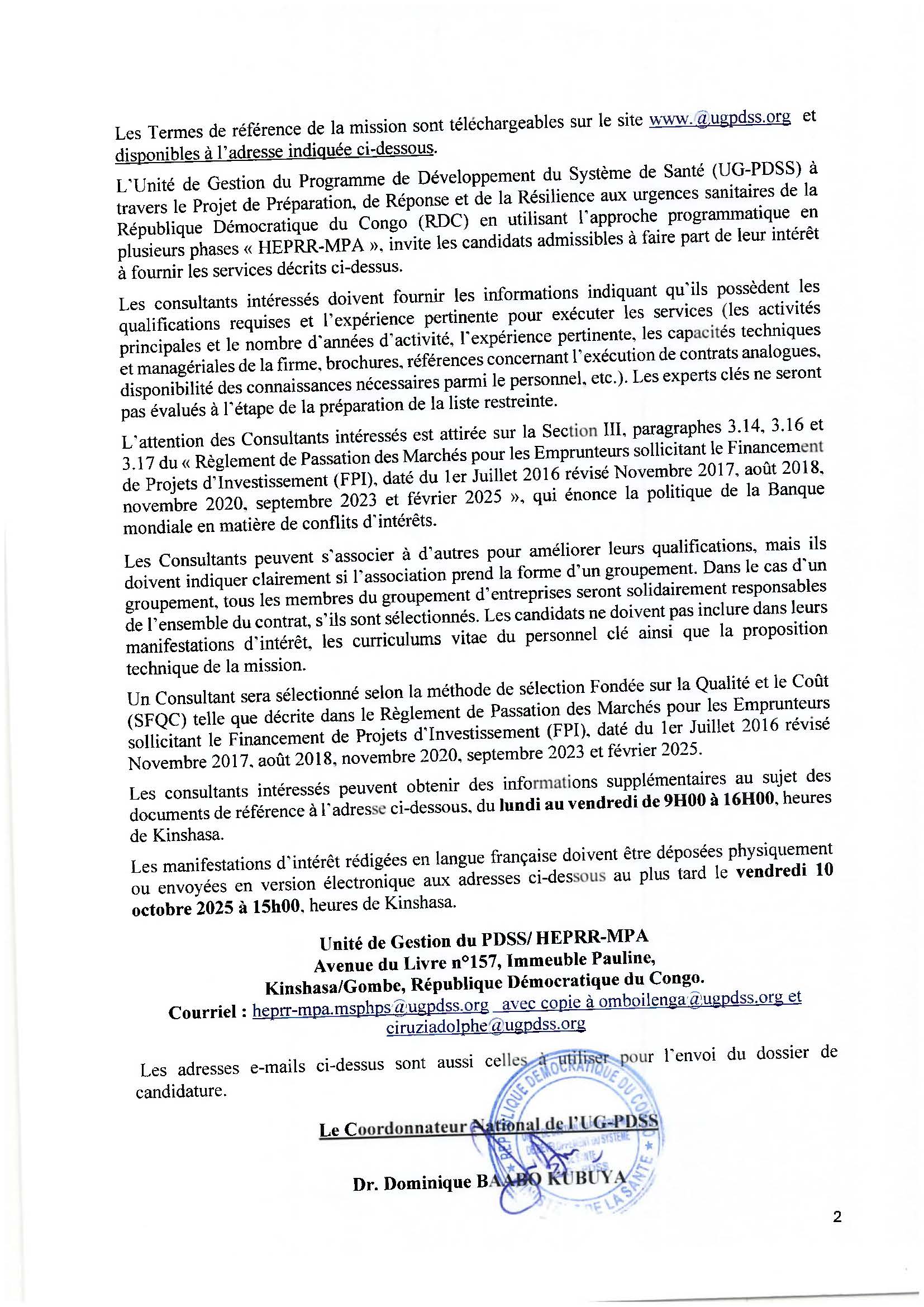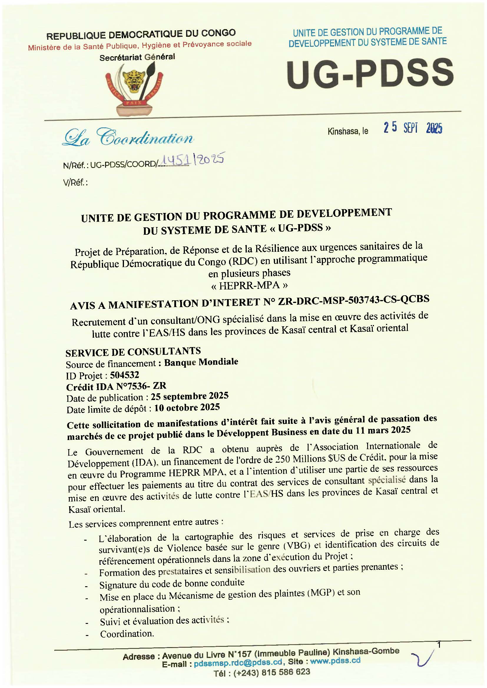 Recrutement d’un consultant/ONG spécialisé dans la mise en œuvre des activités de lutte contre l’EAS/HS dans les provinces de Kasaï central et Kasaï oriental