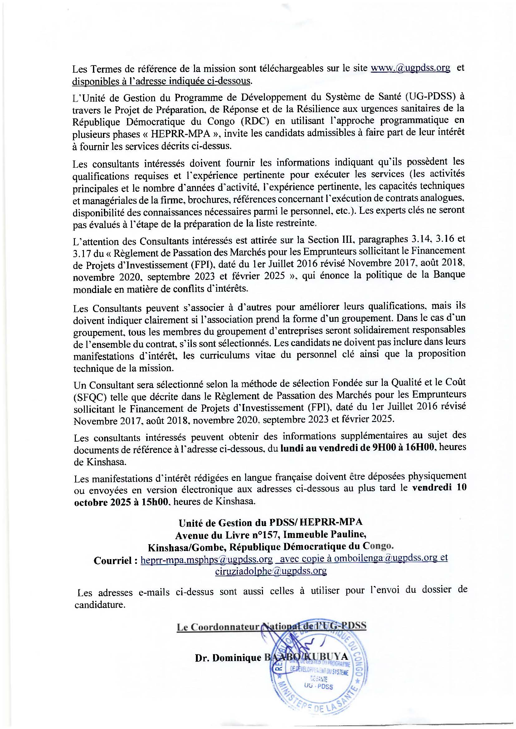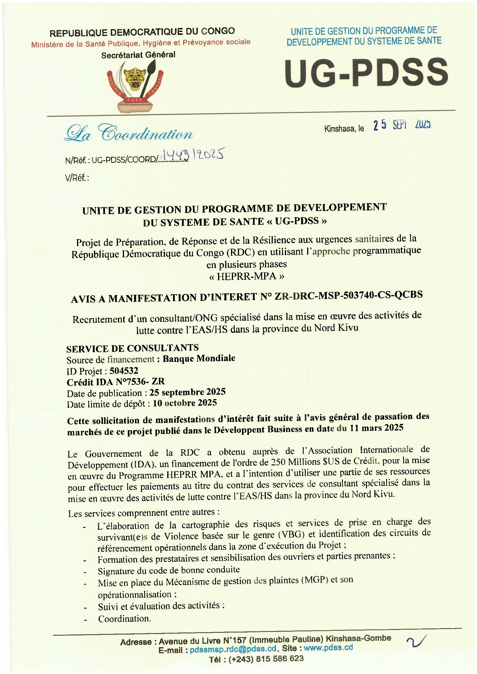 By Guylain Mafuta Recrutement d’un consultant/ONG spécialisé dans la mise en oeuvre des activités de lutte contre l’EAS/HS dans la province du Nord Kivu RDC Publié il y a 7 mois Les candidatures sont actuellement fermées. Site ugpdss UG-PDSS - HEPRR MPA Cliquer ici pour télécharger les termes de référence No Comments 25 septembre 2025
