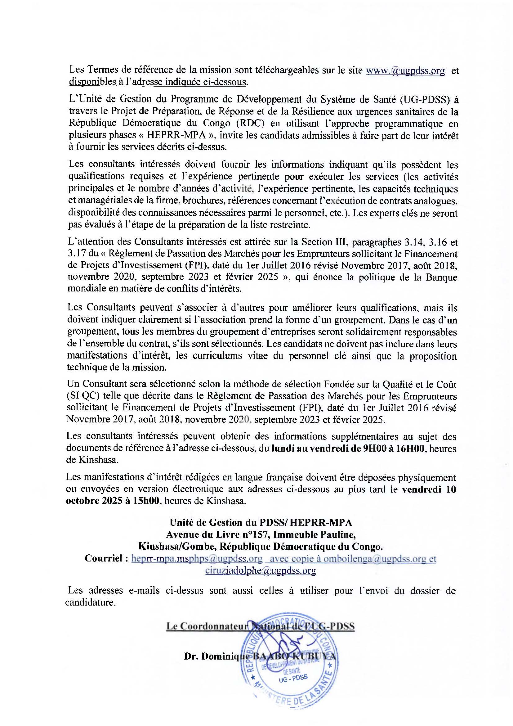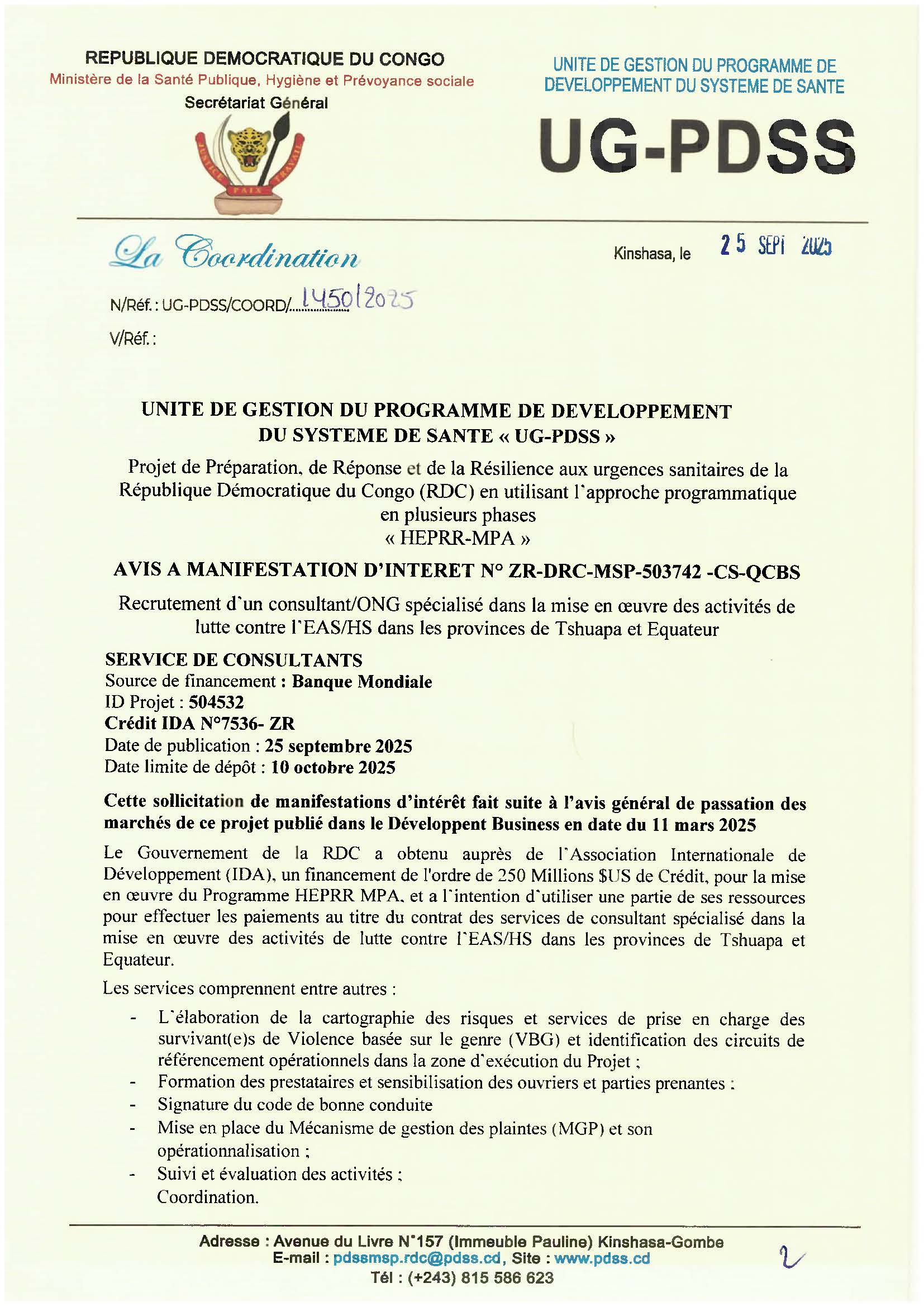 By Guylain Mafuta Recrutement d’un consultant/ONG spécialisé dans la mise en oeuvre des activités de lutte contre l’EAS/HS dans les provinces de Tshuapa et Equateur RDC Publié il y a 7 mois Les candidatures sont actuellement fermées. Site ugpdss UG-PDSS - HEPRR MPA Cliquer ici pour télécharger les termes de référence No Comments 25 septembre 2025