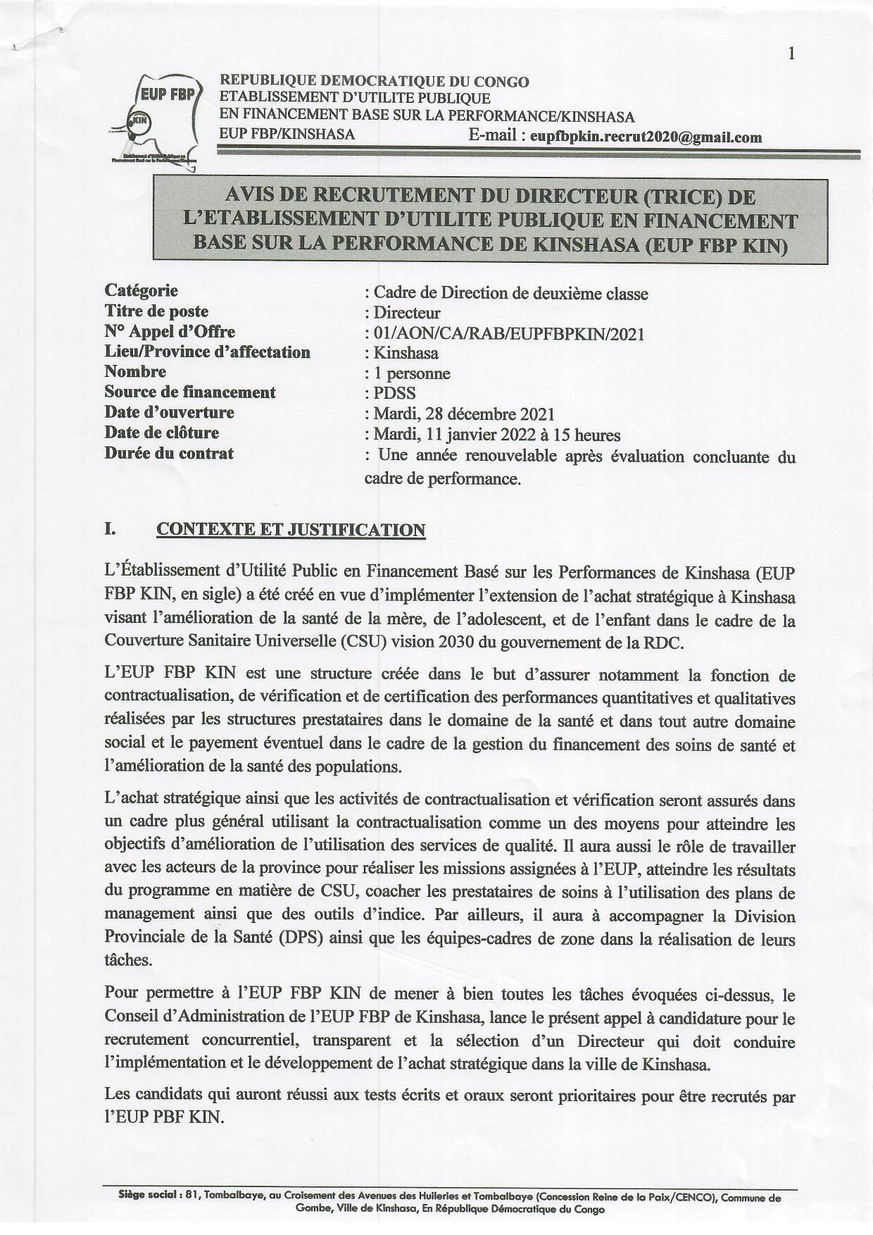 By Guylain Mafuta Avis de Recrutement du Directeur(trice) de l’EUP FBP KIN Avis de Recrutement du Directeur(trice) de l’EUP FBP KIN No Comments 28 décembre 2021
