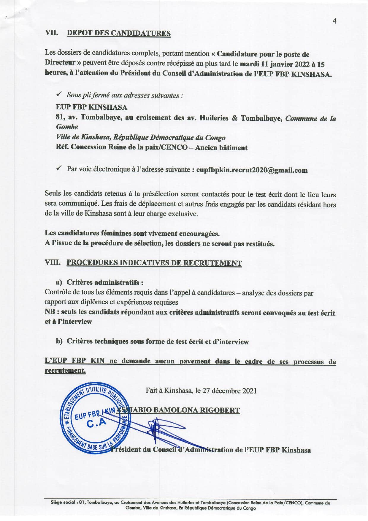 By Guylain Mafuta Avis de Recrutement du Directeur(trice) de l’EUP FBP KIN Avis de Recrutement du Directeur(trice) de l’EUP FBP KIN No Comments 28 décembre 2021