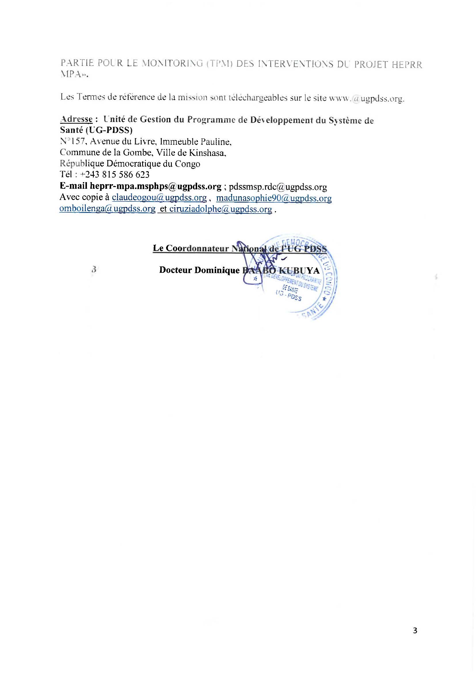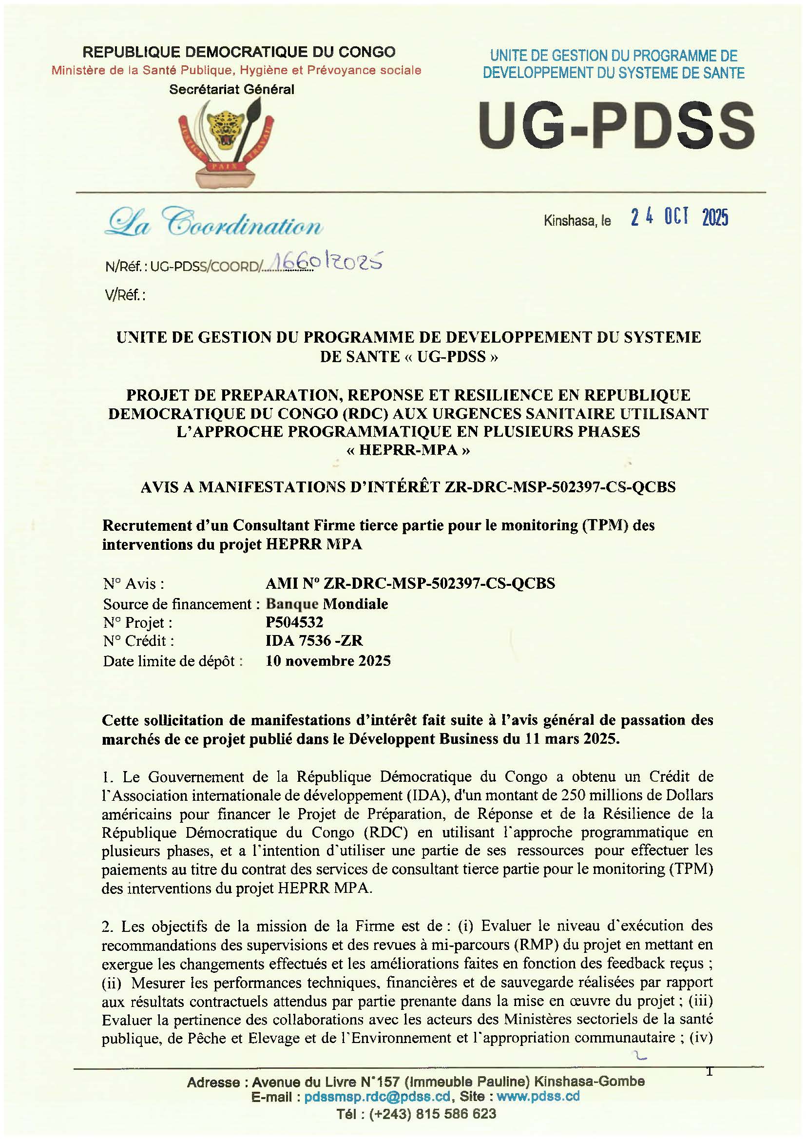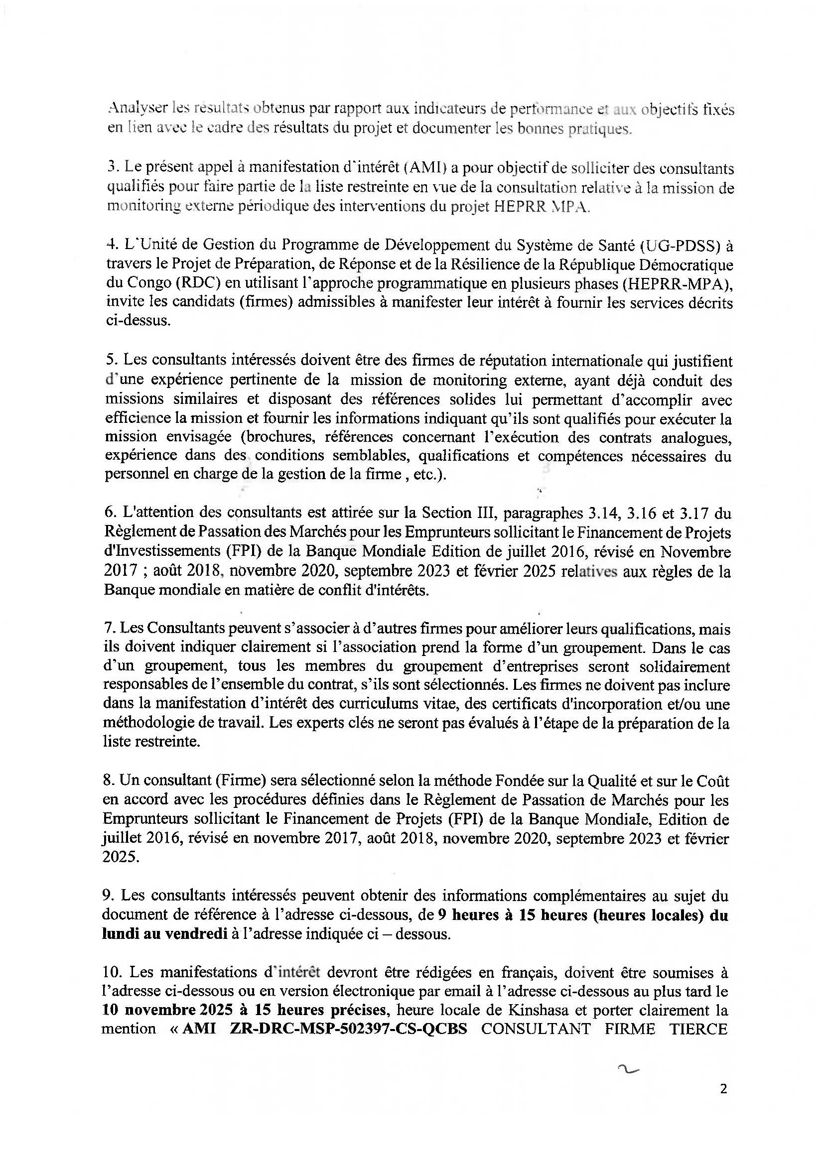 2. Recrutement d’un Consultant firme tierce partie pour le monitoring (TPM) des interventions du projet HEPRR MPA