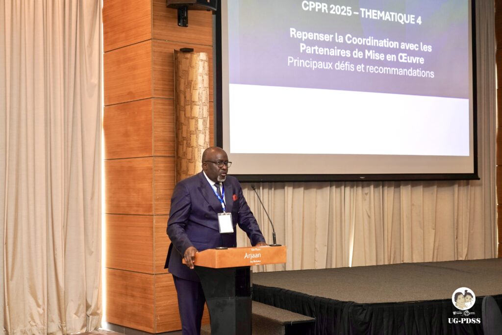 Au cours de cette revue, Dr Dominique BAABO, Coordonnateur de l’UG-PDSS, a présenté la thématique de la coordination avec les partenaires de mise en œuvre. Il a souligné l’importance d’une collaboration étroite pour maximiser l’efficacité des projets et assurer leur alignement sur les priorités nationales.